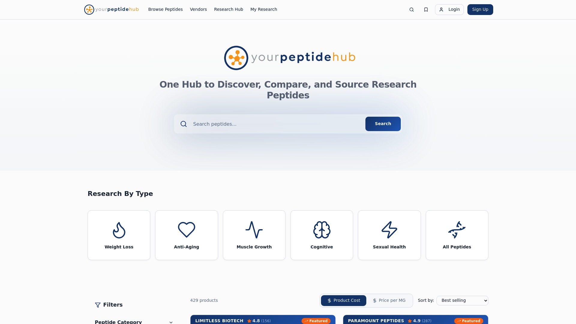 PeptideHub centralizes peptide discovery with search and browse by category, vendor comparisons, and COA verification for quality checks. Users can filter by peptide form, shipping cost, country of origin, and discounts while accessing vendor reviews and research resources.