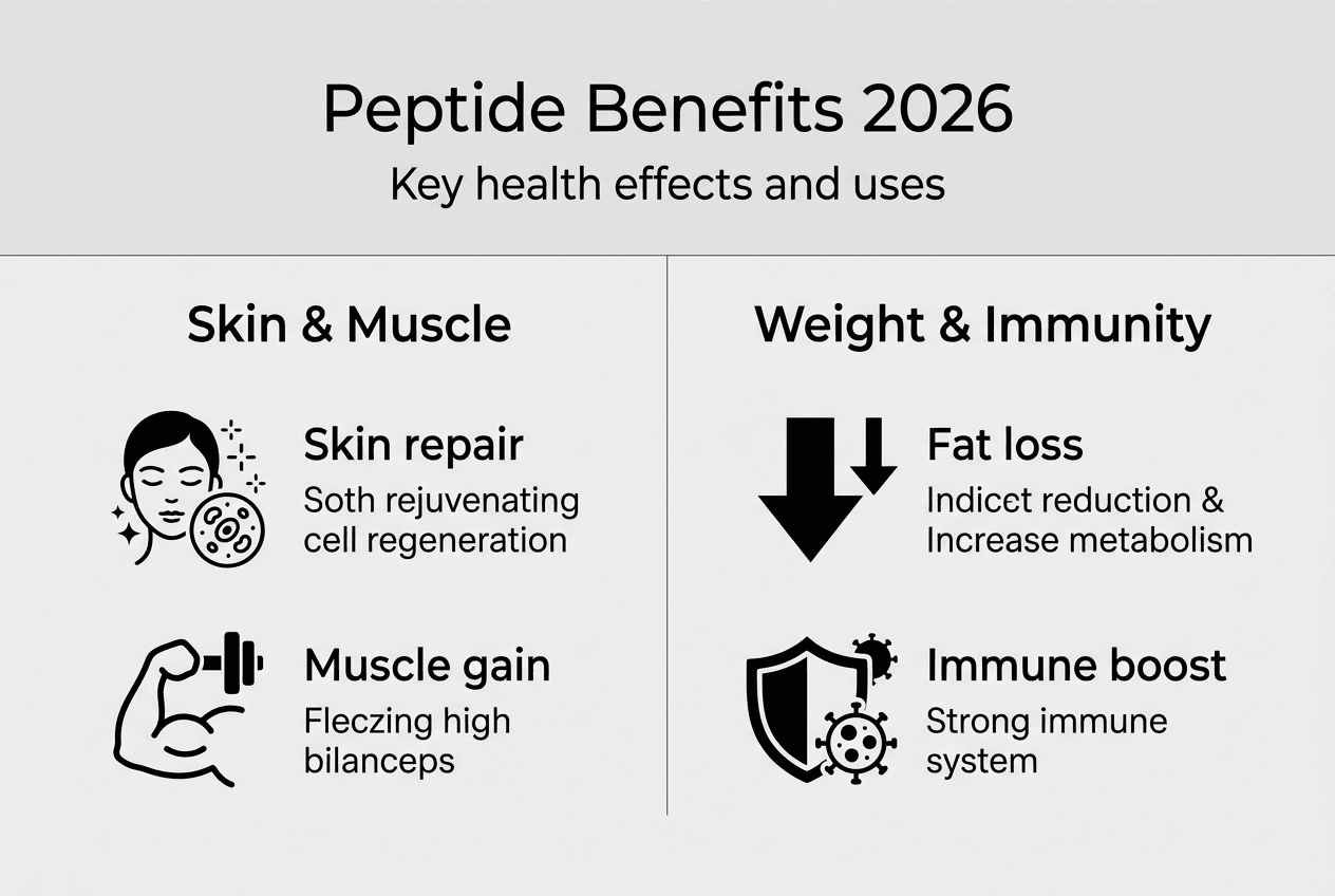 Many people think peptides and proteins are the same thing, but they're actually distinct molecules with different roles in your body. While proteins are large, complex structures, peptides are smaller chains of amino acids that your body absorbs faster and uses for specific tasks like muscle growth, fat loss, and skin repair. Understanding how peptides work can help you make informed decisions about using them for health and fitness goals. This guide explains what peptides are, their science-backed benefits, current research in 2026, and practical applications for muscle building, weight management, and anti-aging.